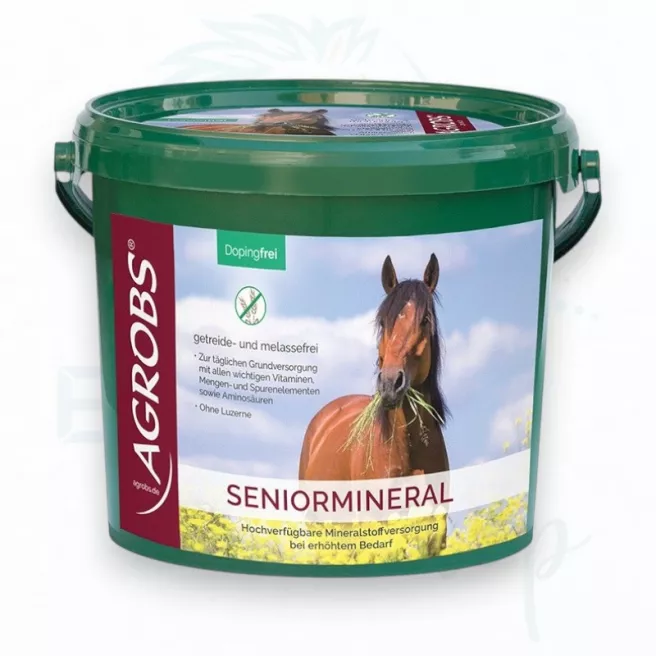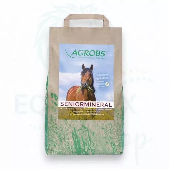 Il est donc primordial de garantir un apport suffisant en vitamines, oligo-éléments et acides aminés essentiels. Outre les vitamines liposolubles A, D et E, Agrobs® Seniormineral fournit également des vitamines B, de la biotine et de la vitamine C pour répondre pleinement aux besoins des chevaux âgés. Grâce à l'ajout de zinc, de sélénium, de cuivre et d'iode, les carences nutritionnelles pouvant survenir avec une alimentation exclusivement composée de foin sont spécifiquement compensées. Agrobs® Seniormineral est enrichi en acides aminés essentiels pour favoriser le développement et le maintien de la masse musculaire. Grâce à sa formule sans céréales ni mélasse, à base de fibres vertes naturelles, Agrobs® Seniormineral convient à toutes les races et tous les types de chevaux. Sa faible teneur en amidon et en sucre permet également de nourrir les chevaux au métabolisme sensible selon leurs besoins.