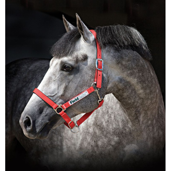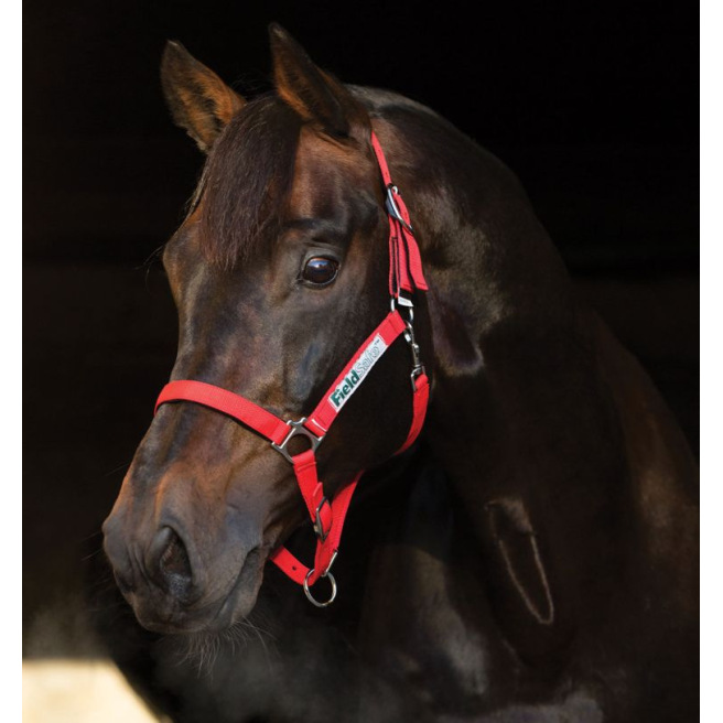 Ce licol est de couleur rouge vif et doté de deux plaquettes réfléchissantes de chaque côté du licol. Cela permet de retrouver plus facilement le licol si le cheval le perd en prairie.