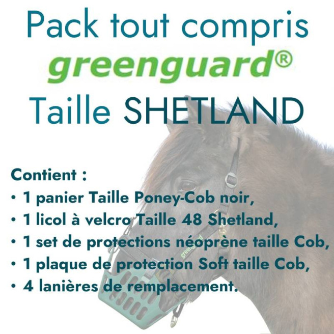 Ce pack est adapté pour les Shetlands. Pour les poneys à nez très très fin (par exemple mini shets arabisés), prendre le pack en taille MINI. Le panier Greenguard® taille petit, c'est donc normal d'utiliser la taille Poney-Cob sur un Shetland.
