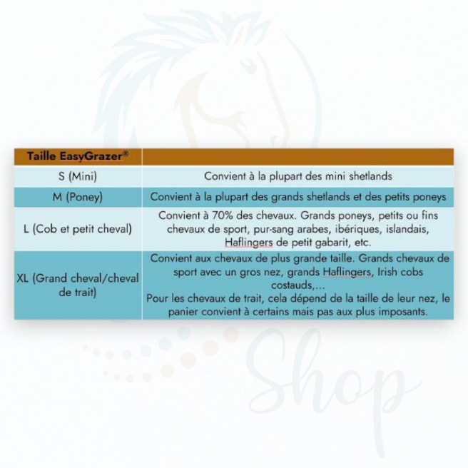 - Pour le panier, si votre cheval ou poney se trouve entre deux tailles, privilégiez la plus grande des deux.