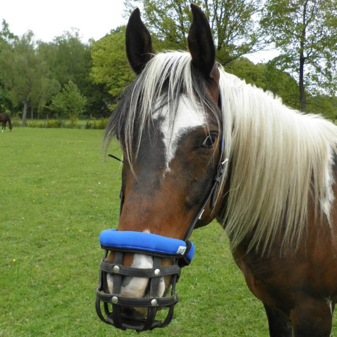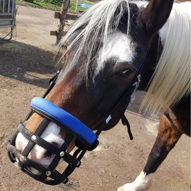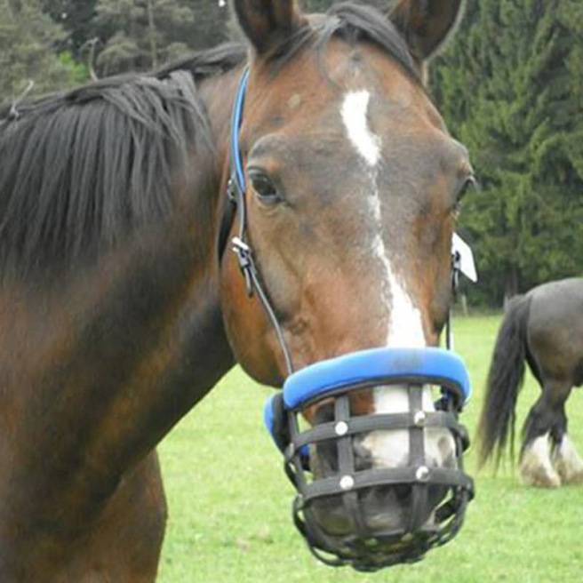 Ce panier de restriction alimentaire est conçu pour être porté par un cheval en prairie afin qu’il puisse rester au grand air avec son troupeau même s’il a une tendance au surpoids ou à l’obésité quand il est à l’herbe H24. Il permet de limiter la quantité d’herbe ingérée et de mettre le cheval « au régime » tout en lui permettant de garder ses interactions sociales.
