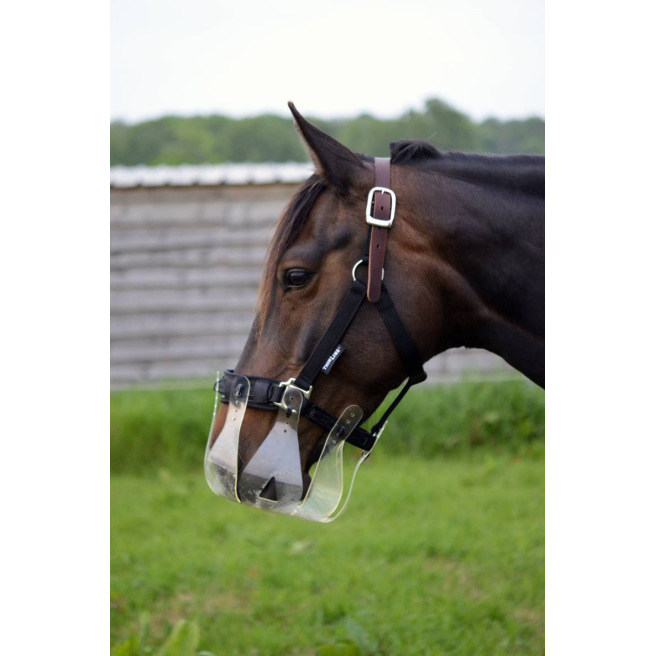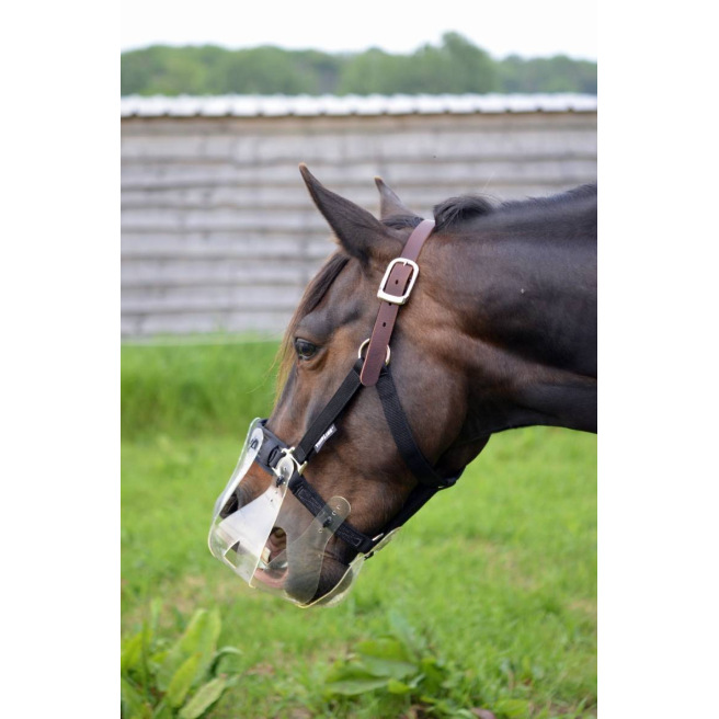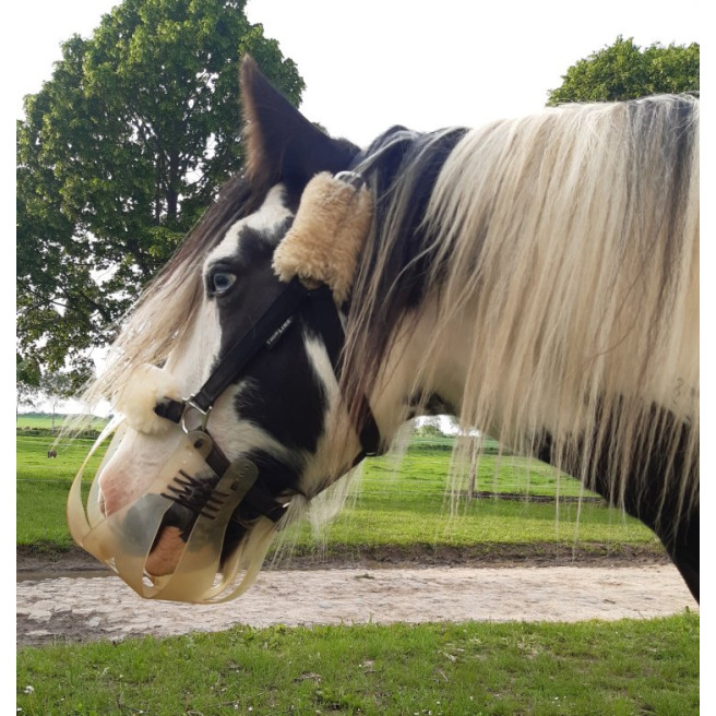 Ce panier de restriction alimentaire est conçu pour être porté par un cheval en prairie afin qu’il puisse rester au grand air avec son troupeau même s’il a une tendance au surpoids ou à l’obésité quand il est à l’herbe H24. Il permet de limiter la quantité d’herbe ingérée et de mettre le cheval « au régime » tout en lui permettant de garder ses interactions sociales.
