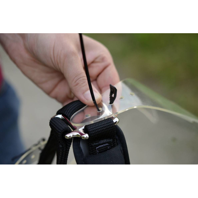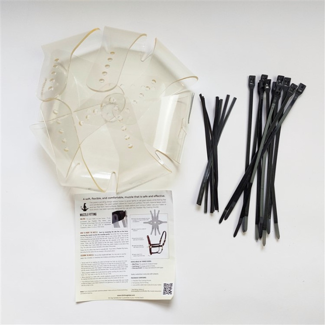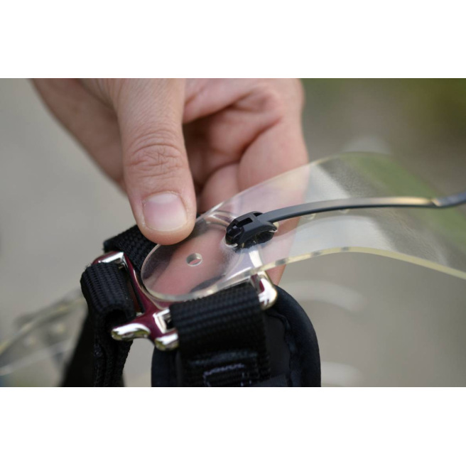 Étape 5 : une fois satisfait du réglage provisoire, retirez le licol et remplacez les attaches provisoires par les attaches définitives (faites cela en dehors de la tête du cheval). Pour cela, passez les dans le trou du panier puis dans l’encoche du licol ThinLine® puis de nouveau dans les trous du panier. Tirez le serflex au maximum près du trou avant de repasser dedans pour le refermer. Serrez le serflex au maximum avant de couper, sans casser le panier. Coupez l’extrémité du serflex qui dépasse une fois fermé. Le serflex doit être fermé de haut en bas comme sur la photo (pour éviter que des débris ne restent accrochés). Pour enlever les serflexs il faut les couper et donc les remplacer. Huit serflexs supplémentaires sont fournis avec le panier. Si nécessaire, des serflexs de remplacement sont vendus séparément. Il est important d’utiliser les serflexs fournis avec car ils sont prévus pour casser plus rapidement que le panier. Si le cheval s’accroche, les serflexs vont céder sans déchirer le panier. Le panier n’est pas garanti s’il est attaché avec des serflexs autres que ceux de la marque.