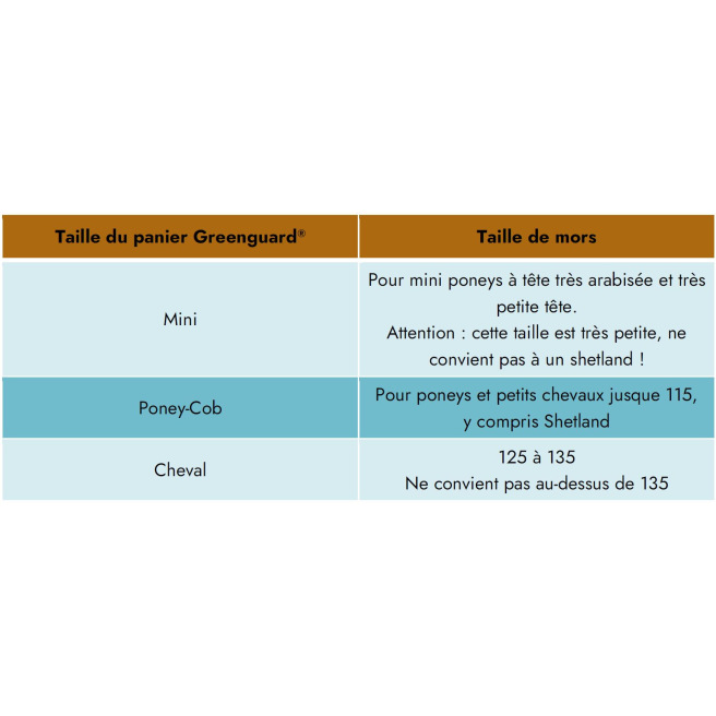 - Pour une réponse rapide h24, nous vous invitons à vous référer au guide des tailles Greenguard® disponible sur cette page. Pour le panier, si votre cheval ou poney se trouve entre deux tailles, privilégiez la plus grande des deux.