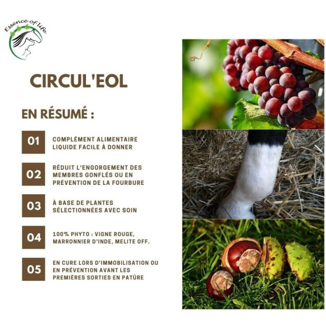 Aliment complémentaire pour cheval ou poney, en solution buvable, destiné à soutenir la circulation. Il aide le cheval à passer certains caps difficiles comme les engorgements des membres, les hématomes importants (à la suite d'une castration par exemple) ou les situations à risque de fourbure (cheval en surpoids sur l'herbe de printemps par exemple).