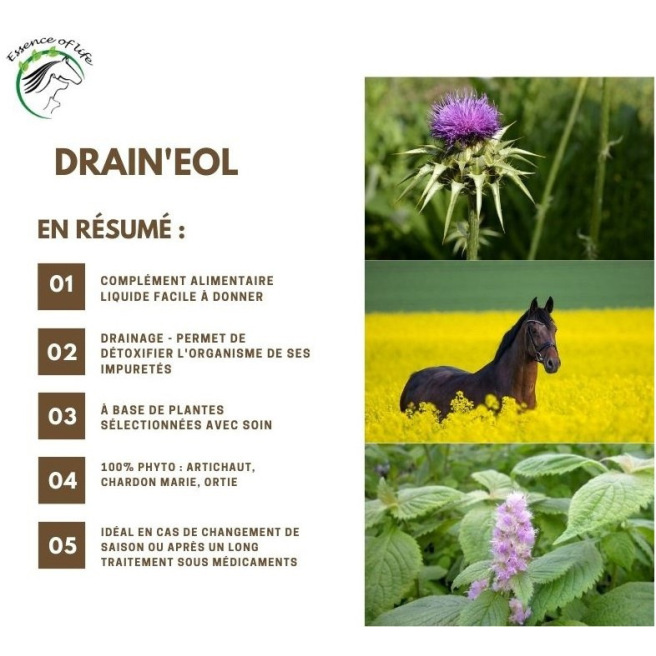 Drain'Eol est indiqué pour des chevaux et poneys ayant subi un passage un peu plus difficile. Il permet de détoxifier l'organisme de ses impuretés en soutenant l'appareil urinaire et hépatique (foie). En routine, il est idéal de faire une cure de Drain'Eol aux changements de saison au début de l'hiver, lorsque le poil s'épaissit. Cela peut être intéressant aussi après le vermifuge. Il est également conseillé de faire une cure après un coup dur pour le cheval (maladie, traitement,...).