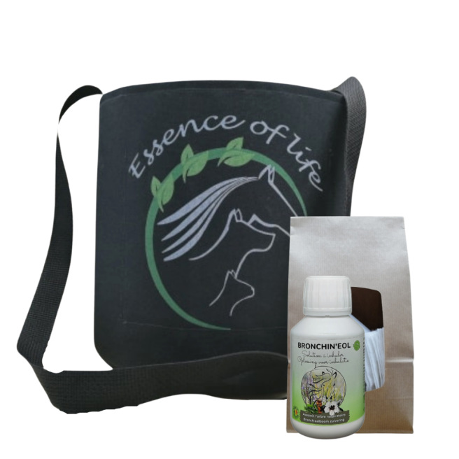 Il se présente comme une musette, facile à attacher. Il permet de glisser un coton imbibé de Bronchin'Eol pour le faire respirer au cheval ou au poney.